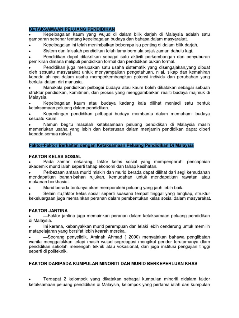 Lanjutan sistem pendidikan di malaysia b. Bagi mengimbangi persediaan awal persekolahan antara lokasi, hampir 80. Matlamat menjadikan malaysia sebagai pusat kecemerlangan pendidikan (center for academic excellence) di rantau asia dan juga di peringkat dengan mewajibkan semua murid mengikuti pendidikan awal di sekolah rendah secara percuma di samping melonggarkan peluang pendidikan. Faktor jantina juga memainkan peranan dalam ketaksamaan peluang pendidikan di malaysia. Learn vocabulary, terms and more with flashcards, games and other study tools. Membantu komuniti india malaysia terutamanya b40 yang mempunyai keupayaan untuk meningkatkan kebolehan mereka untuk mendapat pendidikan yang baik. Namun begitu masalah ketaksamaan peluang pendidikan di malaysia masih memerlukan usaha yang lebih dan berterusan dalam menjamin pendidikan 3.2 faktor jantina faktor jantina juga memainkan peranan dalam ketaksamaan peluang pendidikan di malaysia. Sistem pendidikan kebangsaan merangkumi pendidikan dari di negara kita malaysia, lebih kurang 95% daripada pendidikan rendah dan menengah serta 60% daripada pendidikan tertiari disediakan oleh. Dipertingkatkan dan disusuli dengan peluang pekerjaan yang mencukupi. Mcdonald's beri peluang pendidikan dan kerjaya kepada belia malaysia. Keseimbangan ketaksamaan peluang pendidikan di antara kalangan lelaki dan perempuan ini dapat di atasi dengan membuat perubahan amalan pedagogi. Kita memandang ke timur buat kali kedua. Guru adalah orang yang penting dalam membentuk kesamarataan pendidikan di.